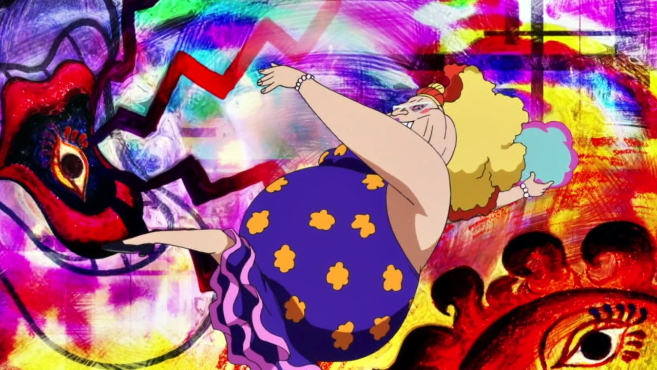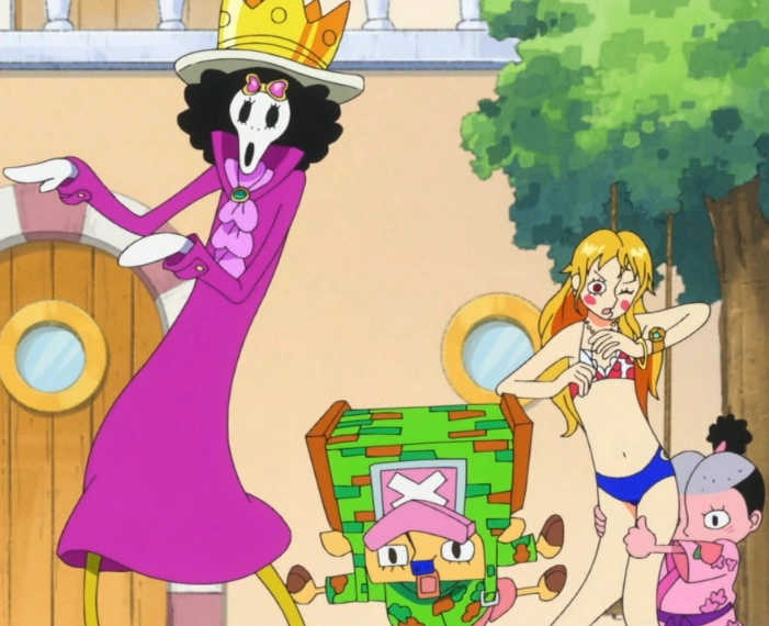 ↑One Piece manga y anime — Vol. 72Capítulo 714 y Episodio 644, Giolla transforma a Nami, Brook, Chopper y Momonosuke en lo que parecen «juguetes».