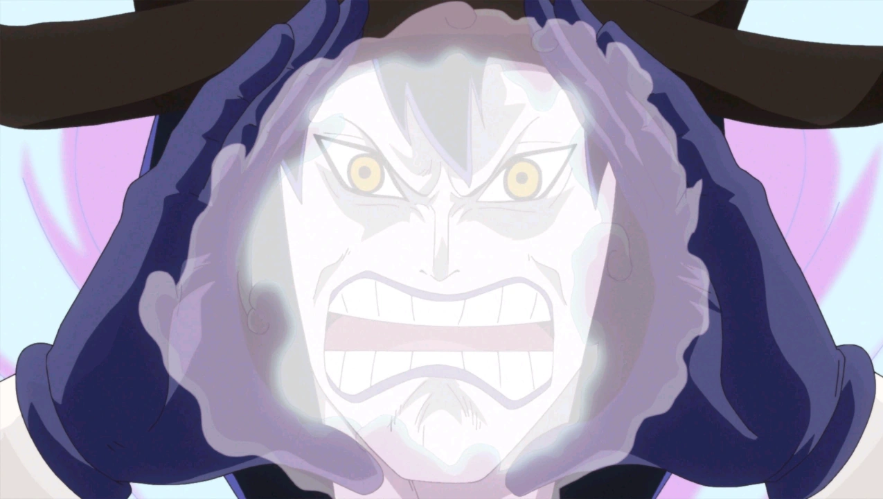 Caesar flotando recibiendo el ataque de Usopp sin ningún efecto para él.