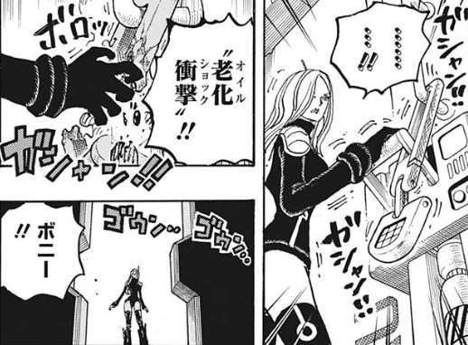 跡死 突き Toshi tsuki?, lit. «Lanza cronológica»): Mientras empuña un arma u otro objeto, Bonney lo lanza hacia un objetivo, envejeciéndolo hasta convertirlo en una versión más joven de sí mismo. Los años perdidos del objetivo se manifiestan en forma de joyas brillantes de diversas formas que son expulsadas de su cuerpo y luego esparcidas. Lo usó por primera vez contra Vegapunk.[7] - Oil shock (