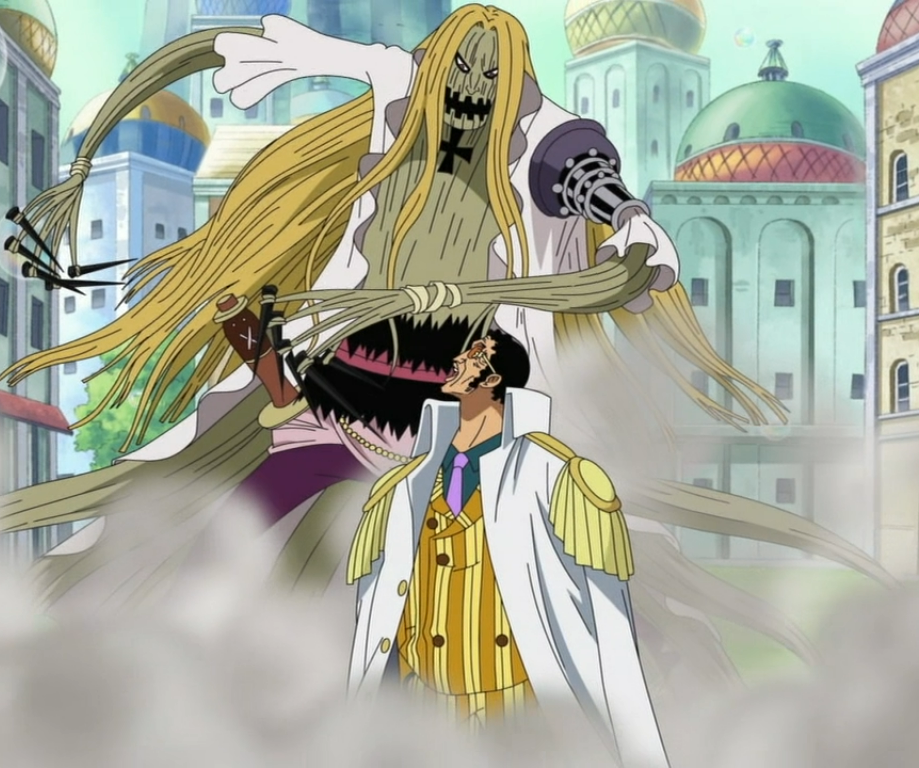 - ↑ 4,0 4,1 4,2 4,3 One Piece manga y anime — Vol. 52 Capítulo 509 (p. 14-17) y Episodio 402, Hawkins se transforma en un gigantesco monstruo de paja durante su combate contra Kizaru.