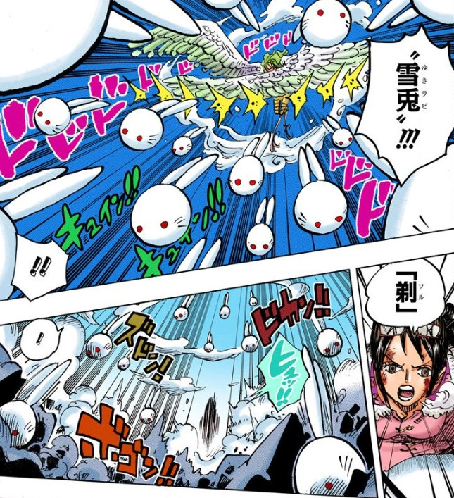 Yuki rabi (雪兎,Yuki rabi?, lit. "Conejos de nieve"): Monet balancea su ala izquierda para liberar numerosas bolas de nieve endurecidas hasta ser sólidas, pequeñas con orejas, bigotes y ojos de conejos. Lo utilizó contra Tashigi, quien lo esquivó con facilidad con su Soru[5]. En el doblaje Latino, esta técnica es llamada Conejos de nieve.