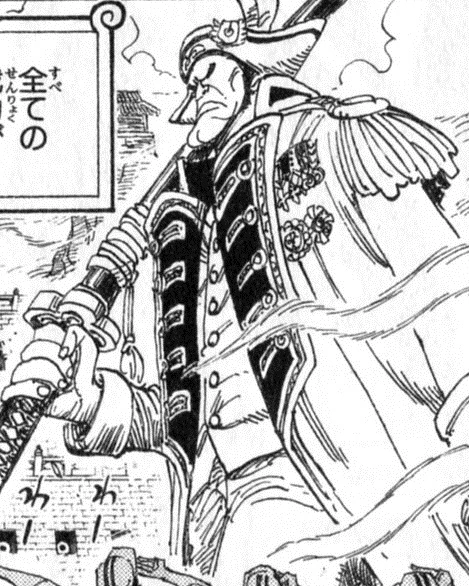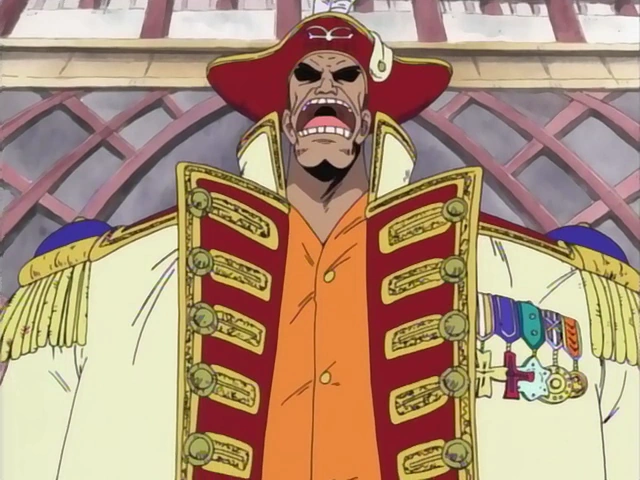 Fue visto, por primera vez, durante el anuncio de la primera recompensa de Luffy. En ese instante, dio un discurso sobre la «Justicia».[2]