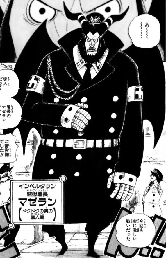 - ↑ 1,0 1,1 1,2 One Piece manga — Vol. 67 Capítulo 665, minihistoria: Desde las cubiertas del mundo Vol. 45, Magellan vuelve a aparecer después del salto temporal, esta vez como vicealcaide.