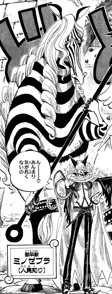 Minozebra se describe como muy tímido. Sin embargo, él es una bestia brutal que torturas a los prisioneros de Impel Down.