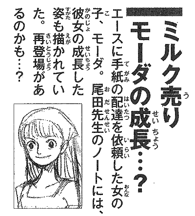 - ↑ One Piece manga — Vol. 30 Capítulo 279, minihistoria: Ace a la caza de Barbanegra Vol. 7, Moda es vista trabajando de lechera.