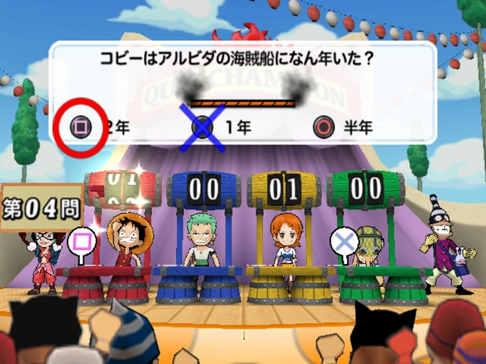 Galería de tiro del Going Merry (ゴーイングメリー砲台射的競争 Gōingumerī hōdai shateki kyōsō?): Los jugadores usan los cañones del Going Merry para disparar islas (y el barco ocasional Marine) para conseguir puntos.