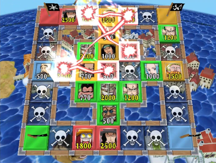 Concentración de piratas (海賊カードあわせ Kaizoku kādo awase?): Los jugadores se turnan para voltear fichas en una balsa gigante con miembros de los Piratas de Sombrero de Paja, en busca de coincidencias.
