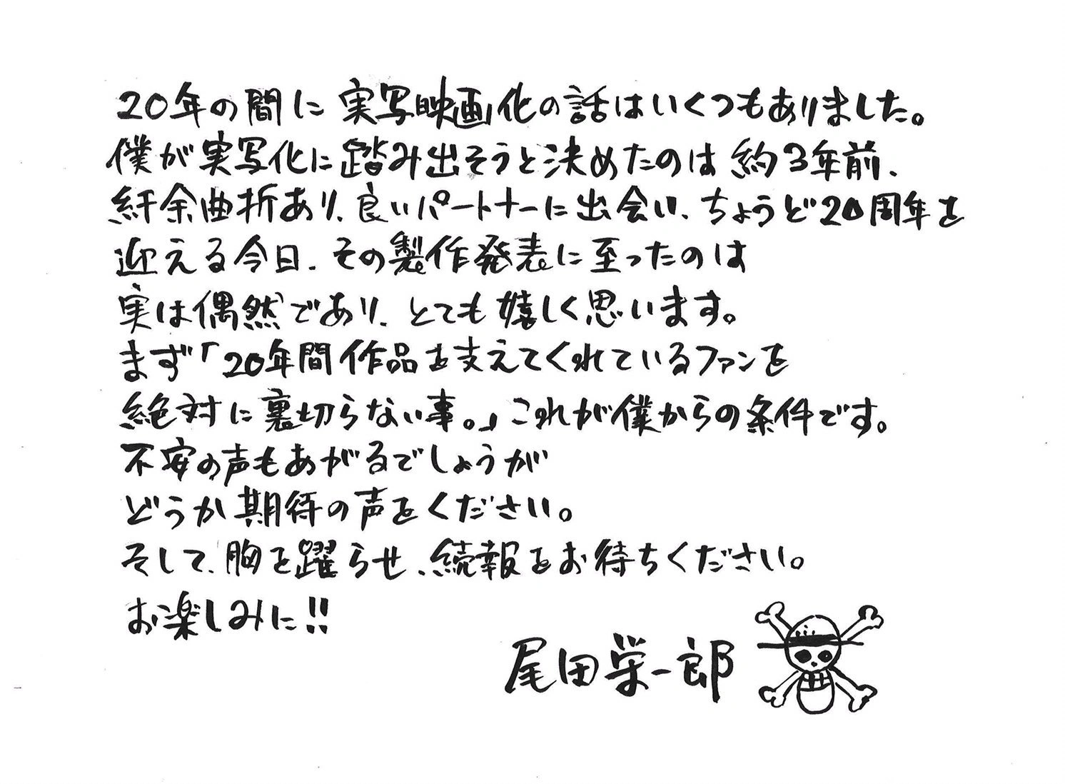 En los últimos 20 años siempre han existido intenciones de realizar una serie de imagen real de One Piece. Hace unos tres años, decidí que era el momento de realizarlo. Después de mucho buscar, encontré un buen socio. Hoy, en el vigésimo aniversario de la serie, podemos anunciar la producción de este proyecto. Aunque la fecha sea una coincidencia, estoy muy feliz.