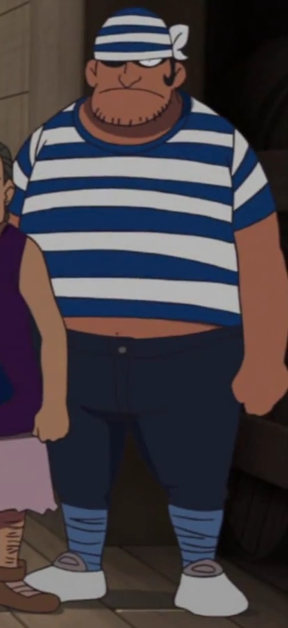 Él y sus dos hermanos son los piratas que querían abrir el barril en donde se encontraba Luffy porque pensaban que estaba lleno de sake. Cuando Luffy salió del barril, todos empezaron a gritar. Debido a esto, Alvida le lanzó su maza de hierro para que se callaran, haciendo que Luffy y Koby escaparan.