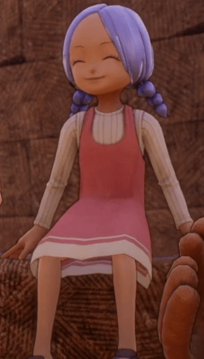 Renny es una chica joven con el pelo gris. Lleva un vestido rosa con una camisa blanca debajo.[1]