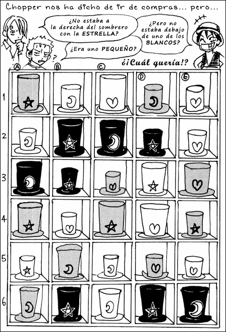O: ¡¡Aquí tenemos un juego!! Gracias a Muko-chan de la prefectura de Fukushima. ¡¡Busca el sombrero que Chopper quiere comprar!!