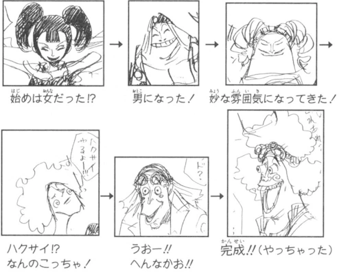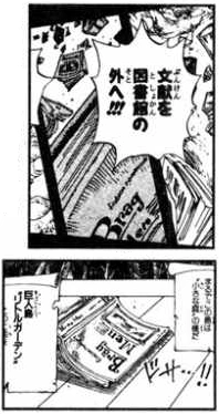 D: Ahora, tengo una pregunta. ¡Acerca de los libros que lanza el grupo de Olvia en la quinta viñeta de la página 170 en el volumen 41!¡¡Un libro se llama "Brag Men"!! ¿¡No es ese el mismo libro que Nami estaba leyendo en la página 142 del volumen 13!? ¿¡Cierto!? ¿¡No!? Vale, lo he preguntado tres veces. Si estoy equivocado, llamaré al timbre de tu puerta y saldré corriendo. -Soge Queen ☆★