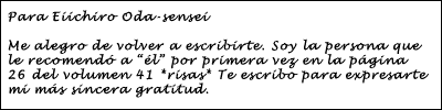 D: ¿Es cierto que haces que Luffy y el resto (especialmente los hombres) siempre digan "おれ" (ore = yo) en hiragana? ¡¡Lo haces!! ¿No es cierto? Entonces, ¿¿hay alguna razón para ello?? Podías haber escrito "オレ" (en katakana) o "俺" (en kanji), ¿¿por qué entonces en hiragana?? ¡No dejo de preguntármelo! P.N. My Call Waiting is Luffy - Narin