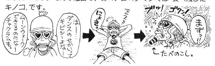 D: Sé que está la fruta Gomu Gomu, la fruta Bara Bara y todas esas frutas del diablo, pero déjame explicarte una que he inventado. Se llama fruta Gero Gero (Vomito Vomito). El poder hace que estés ******ndo, así nadie se te querrá acercar. Muuuuy útil.