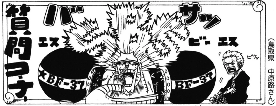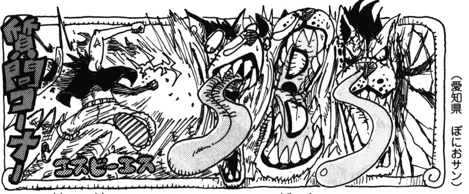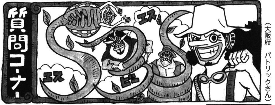 D: Oda-sama. Holaoooo. En el tercer panel de la página 151 en el volumen 65, hay un calamar parado junto a Ikaros, entonces, ¿podría ser "Daidalos?" Eso es correcto, eso tiene que ser correcto, ¡¡¡seguramente así es como es!!!? PN Chagero's Friend Iwaken