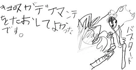 D: (con letra de niño) Estoy contento de que Kyros haya vencido a Diamante. (En la imagen pone "Bastardo")