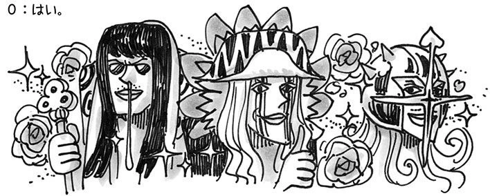 D: Odacchi. Esto es repentino, pero quiero convertir a los altos ejecutivos de la familia Donquixote (Trébol, Diamante y Pica) en bellezas utilizando el "Shot Parage" de Sanji. PD: Idiota Suave.