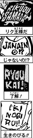 D: Oda sensei las encontrado en el capítulo 785 encontrar gente vistiendo ropa en las que ponían cosas como una especie de juego de letras ya que son letras que en las camisetas están desordenadas pero que realmente al ordenarlas tienen un significado que serían: