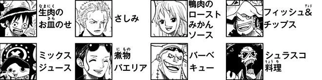 (Luffy: Carne cruda en un plato; Zoro: Sashimi; Nami: Pato asado con Salsa de Naranja; Usopp: Pescado y patatas; Chopper: Jugo Mezclado; Robin: Paella; Franky: Barbacoa; Brook: Churrasco)