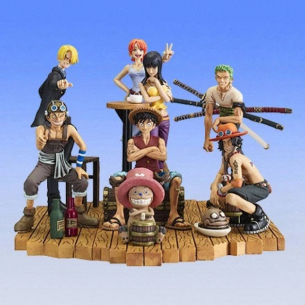 Las bases se pueden combinar entre sí para formar una gran balsa. Las figuras son Luffy, Zoro, Nami, Usopp , Chopper, Robin y Ace.