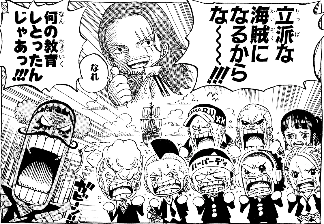 - La lección que les da Shanks a los alumnos es como se deletrea Jolly Roger (dokuro) en katakana. Una enseñanza destinada en origen a alumnos de preescolar.