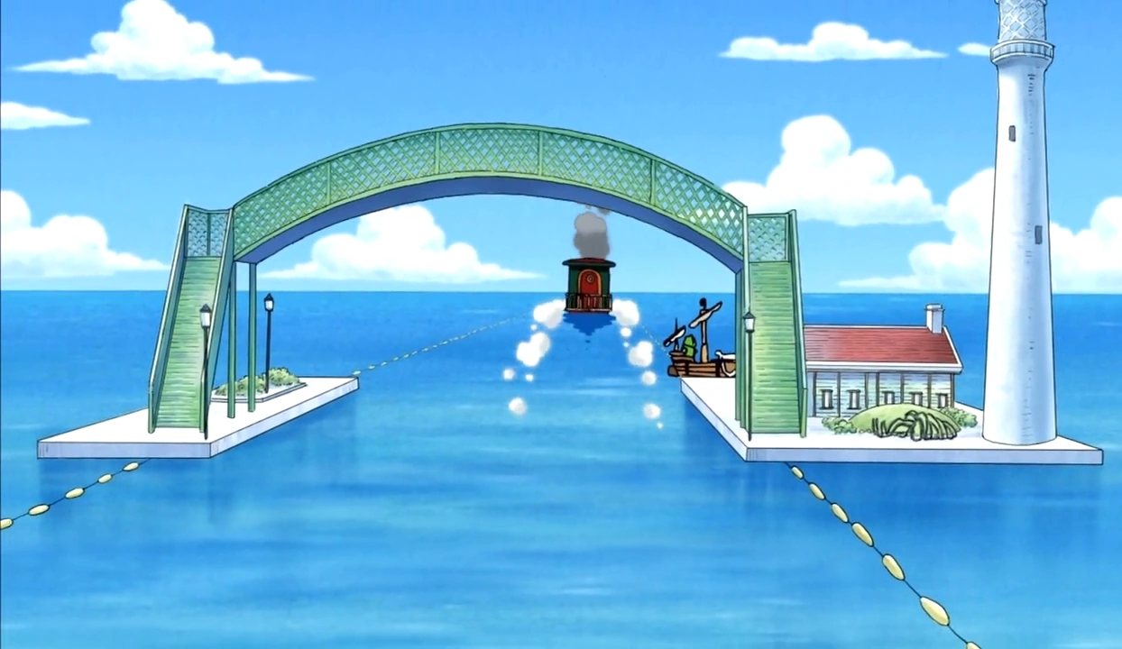 Los trenes marítimos eran utilizados como transporte por la gente que vivía en un pequeño archipiélago donde desembarcaban los Piratas de Sombrero de Paja. Varias líneas de trenes marítimos conectan la isla Dock y la isla Secon, así como otras islas de los alrededores. El sistema ferroviario era mucho más elaborado que el utilizado por Water 7, empleando señales y cruces para facilitar el viaje. Los propios trenes también eran más modernos y refinados, su diseño se inspiraba en las locomotoras 3700 City Class utilizadas por la Great Western Railway.[2]