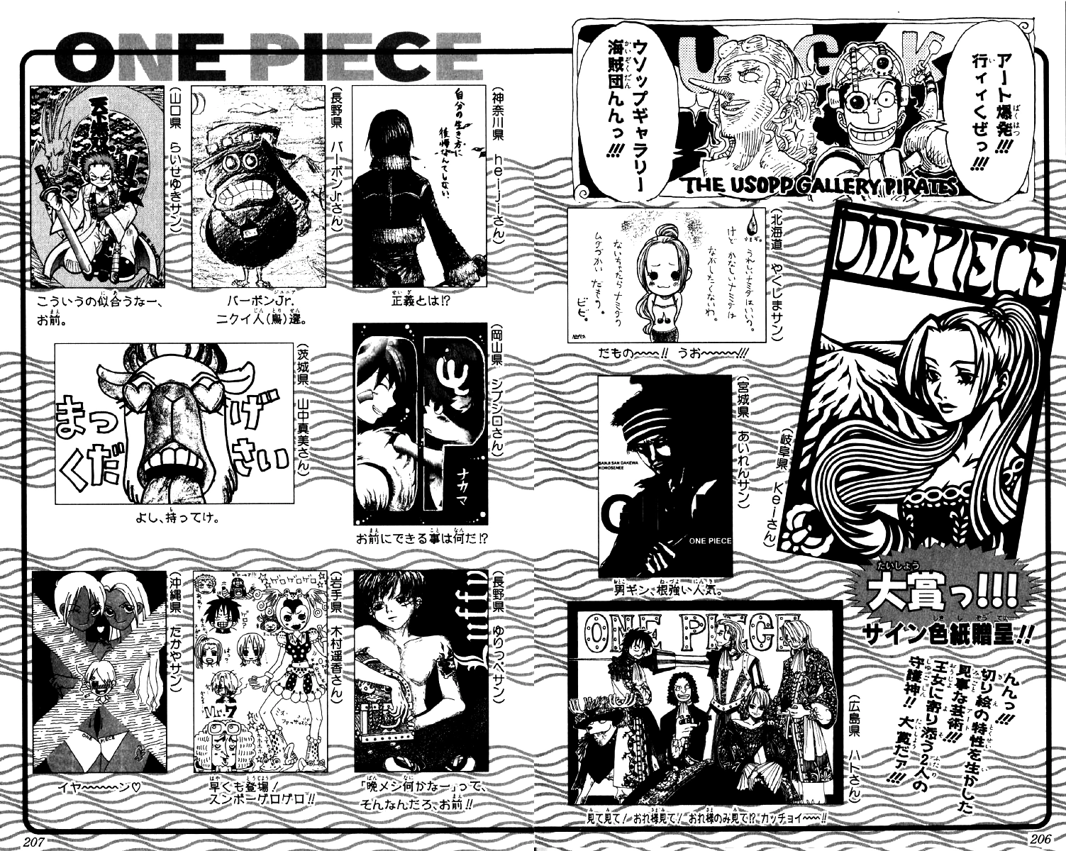 Galería de los Piratas de Usopp (ウソップギャラリー海賊団 Usopp Garari Kaizokudanes?) es un segmento donde la gente puede mandar a Eiichiro Oda sus propios dibujos para que salgan en el volumen. Esto se mencionó en el volumen 4. Esta sección se encuentra en las páginas 206 hasta la 213.