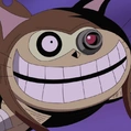 Es un gato zombi cosido, con lo que parece llevar un gorra de piloto. Su sonrisa inquietante le hace parecerse o basarse en el Gato de Cheshire de Alicia en el país de las maravillas. Tiene el numero 193 en su parte inferior. Se le vio por primera vez jugueteando junto a los otros Zombis salvajes.[27] Se le vio mas adelante en los pasillos de la mansión de Hogback, caminando frente a Usopp y Chopper mientras custodiaban la entrada al baño, donde estaba Nami.[29]