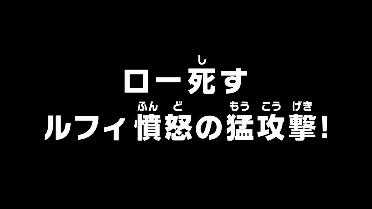 Retour au présent : Viola a annoncé à ses compagnons la mort de Trafalgar Law et tous gardent le silence devant cette terrible nouvelle. Après avoir écouté sa fille, Riku décide de descendre dans la ville basse pour sauver le plus possible de gens d'une mort certaine et il est bientôt suivi par de nombreux citoyens, trop heureux de servir à nouveau leur ancien souverain. Pendant ce temps, Doflamingo regarde Law se vider de son sang et a toutes les peines du monde pour calmer sa colère. Trebol réussit à le dérider et Doflamingo savoure l'idée de récupérer bientôt le Ope Ope no Mi. Alors qu'il s'apprête à réduire le périmètre de la "Cage à Oiseaux" qui enveloppe l'île, Luffy fait son apparition bien décidé à régler son compte. Doflamingo le regarde et lui annonce qu'il est arrivé trop tard pour sauver son ami après avoir appris que Luffy avait vaincu Bellamy qui avait refusé de fuir. Fou de rage, le Chapeau de Paille utilise son "Elephant Gun" pour frapper son ennemi mais ce dernier arrête son attaque en se servant de ses pouvoirs. Loin de se laisser abattre, Luffy entame un duel à mort avec Doflamingo en se servant de ses techniques de combat les plus puissantes. Soudain, il remarque Law gisant en sang sur le sol. Il essaie de le ranimer mais sans le moindre succès. Il constate que son ami était mort, une situation qui satisfait beaucoup Doflamingo qui continue de narguer le Chapeau de Paille. Celui-ci, excédé par ses railleries, contre-attaque et utilise même la technique de Bellamy pour terrasser Doflamingo et Trebol. Mais le maître de Dressrosa arrête de nouveau ses attaques d'un revers de main.