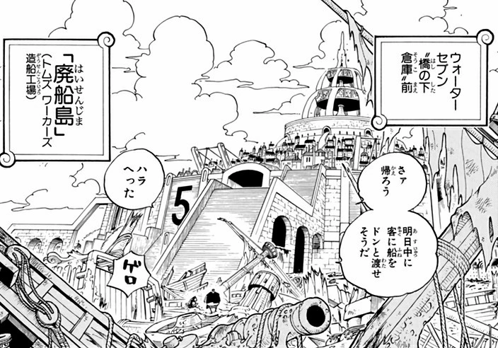 Au cours de l'Aqua Laguna, le Vogue Merry s'est échoué ici. Icebarg, à la demande du navire, a fait ce qu'il pouvait faire pour le réparer. Après les événements d'Enies Lobby, Franky a commencé la construction du nouveau navire pour les Pirates du Chapeau de Paille. Enfin, il a été le théâtre du départ des Chapeaux de Paille pendant que Garp leur lançait des boulets de canon avant que ces derniers ne s'échappent en utilisant un Coup de Burst.