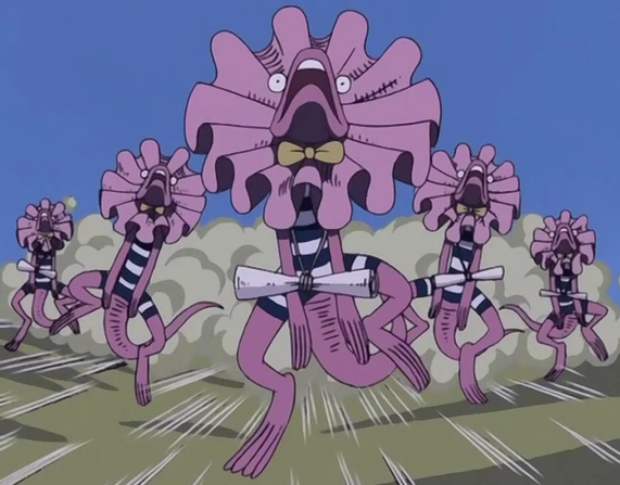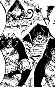 Ce sont des Rois des Mers pacifiques qui ont une tête de singe et une peau écaillée.[24]. Ils apparaissent sur Grandline après que les Mugiwara sortent de Skypiea.