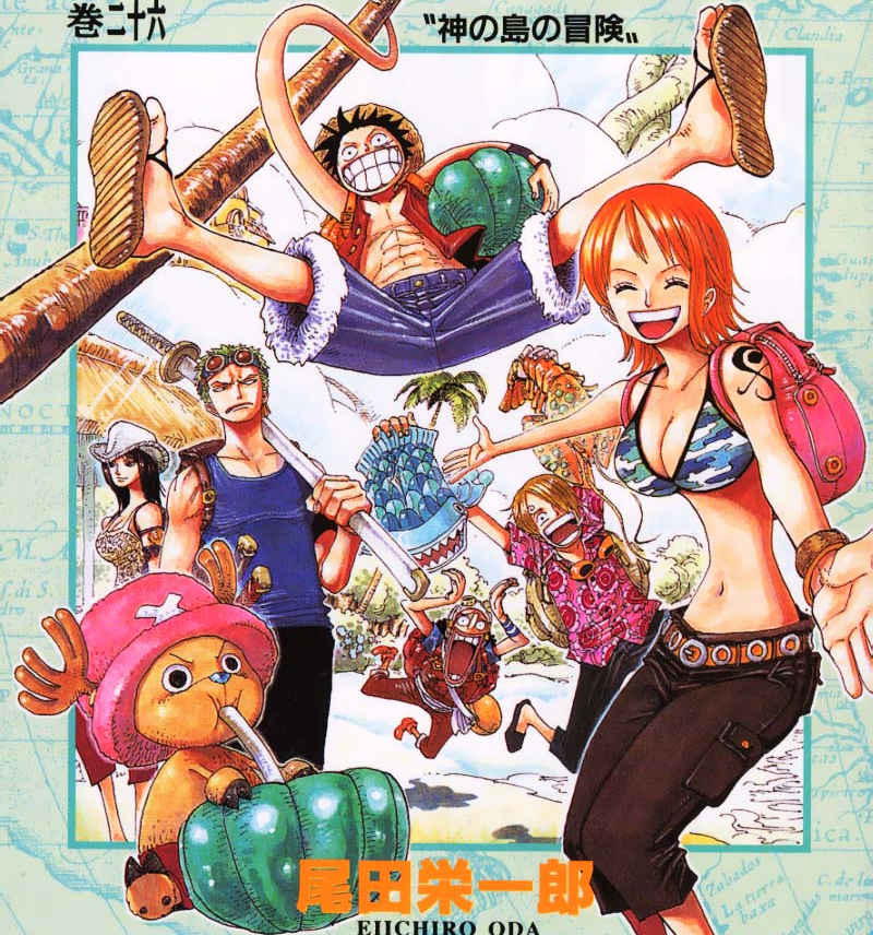 Par le billet du Homard-Express, le Vogue Merry et son équipage traverse une sorte de rivière de nuages en spirale. Ils aperçoivent ensuite un écriteau avec marqué dessus "Godland Skypiea" (Le pays Divin Skypiea) indiquant qu'ils sont à la sortie. L'Équipage arrive donc à Skypiea et il crie de joie devant la beauté de cette île. Ils s'arrêtent sur une plage pendant que Luffy, Usopp et Chopper décident d'aller jouer. Ils sont d'ailleurs très étonnés par le sol, qui est tout moelleux. Zoro lui, plus sérieusement essaye de trouver un moyen de jeter l'ancre, mais il se rend compte que c'est impossible à cause du fait que la mer n'a pas de profondeur. Sanji se déchausse et part rejoindre les trois autres tandis que Nami se fait attaquer par l'oiseau de Jaya car ils avaient oublié de le relâcher. Elle demande ensuite à Zoro s'il a jeté l'ancre et il lui répond en disant qu'il l'a amarré à un des gros nuages qui semblent soutenir l'île. Puis, Robin s'étonne