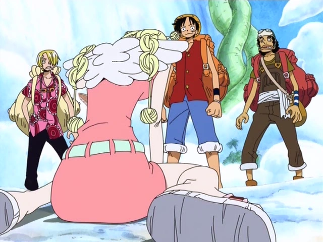 Luffy, Usopp et Sanji se rendent ensuite sur Lovely Street, accompagnés de Conis pour louer une gondole et ainsi aller à Upper Yard en passant par la Milky Road. Ils s'arrêtent devant une étrange statue et Conis leur explique qu'elle représente Vearth, l'idole de Skypiea et pendant que Mc Kinley les observe en se cachant derrière un poteau. Elle leur montrera ensuite la gondole qu'elle leur prêterait et qu'elle utilisait avant le Waver mais Luffy décline l'offre car il veut la gondole à côté, qui est plus imposante. Sanji lui dit de se taire car c'est une question de galanterie. Conis leur indique ensuite le chemin pour arriver à Upper Yard avant que Luffy lui demande pourquoi elle tremble depuis tout à l'heure, cette dernière lui répond qu'elle ne voit pas de quoi il parle. Il continue en lui faisant remarquer qu'elle est toute pâle et Conis lui demande pourquoi ils ne trouvent pas bizarre qu'elle les ai conduit jusqu'ici sans que personne ne les arrête. Mc Kinley qui les observe chuchote en disant qu'elle ne plus doit plus dire un mot avant que d'autres citoyens ordonnent à Conis de se taire. Sanji pense alors que toute la population est de mèche avant que Conis s'agenouille devant eux. Les habitants lui ordonne à nouveau de se taire mais en vain...