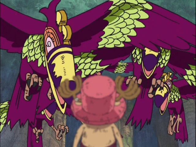 Luffy le remonte donc ensuite grâce au Gomu Gomu no Mi mais il ramène également deux monstres marins, un poulpe et un serpent. Zoro bat le poulpe et Sanji bat le serpent. Usopp s'évanouit à nouveau et Robin commence à discuter à propos de la forme particulière du poisson céleste qui avait été ramené en même temps que les deux monstres marins, avant que Sanji le cuisine pour Luffy. Chopper se met à observer la mer de nuages grâce à des jumelles mais il voit une étrange silhouette faisant exploser un bateau à l'horizon. Il prend peur, crie car elle se rapproche du bateau et bat sans aucun problème, Luffy, Sanji et Zoro. Heureusement, un mystérieux chevalier chevauchant un oiseau empêche la silhouette de détruire le Vogue Merry et la fait fuir. Il leur dit ensuite qu'on l'appelle "Le Chevalier du Ciel" et qu'il est à leur service.