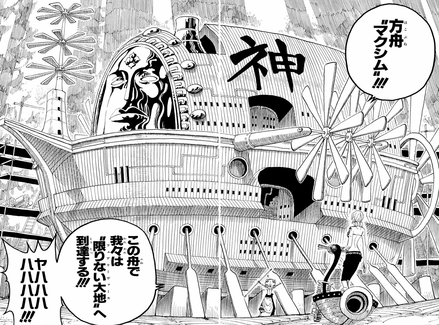 L'Arche Maxime (方舟マクシム, Hakobune Makushimu) est une arche volante colossale, utilisée par Ener afin de rejoindre Fairy Vearth (Lune). Elle a été construite par les hommes de Gan Forr pour Ener. Elle vole grâce aux pouvoirs du Goro Goro no Mi d'Ener.