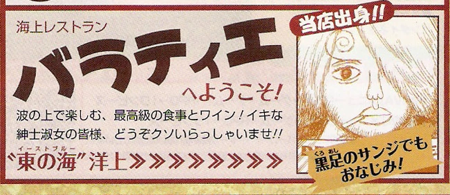 - Une publicité pour le Baratie a été incluse dans le numéro supplémentaire du Grand Times n° 1192 (One Para 3). La publicité comprenait une photo de l'avis de recherche de Sanji et mentionnait son lien avec le restaurant. À juste titre, les Baratie utiliseront plus tard l'infamie de Sanji comme argument de vente auprès des Nasugasira.