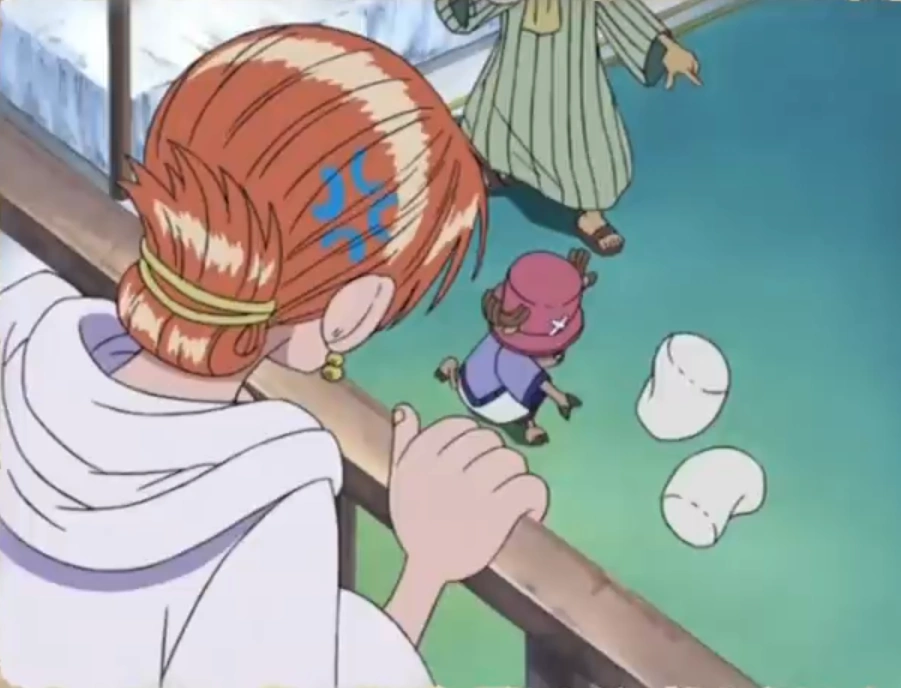 - ↑ One Piece Anime — Épisode 2 : Les onigiris de Rika sont remplacés par des cookies.