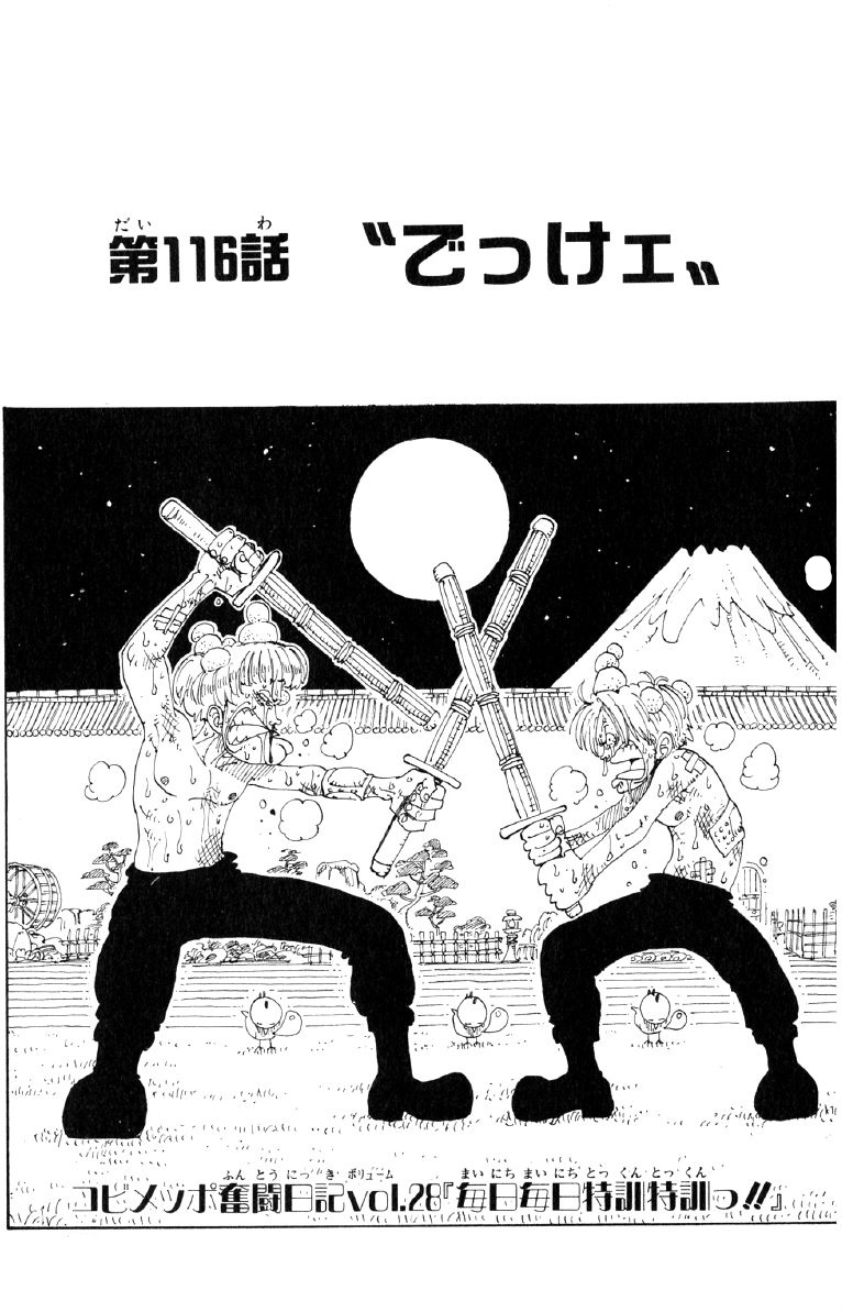 Les chapeaux de pailles rencontrent sur l'île deux géants : Nami et Usopp sont invités par l'un d'eux, Brogy, à un festin. Quand à eux, Kaloo, Vivi, et Luffy font la connaissance de Dorry qui a évité à Luffy de se retrouver dans le ventre d'un dinosaure. Les deux géants habitent sur Grand Line, mais s'affrontent depuis bientôt cent ans. Vivi ne comprend pas pourquoi leur duel dure aussi longtemps mais Luffy a une idée sur la question.