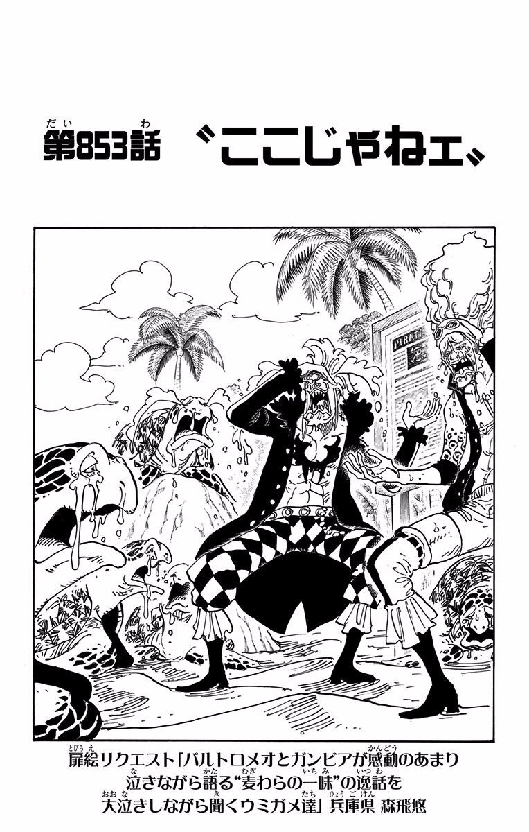 Requête de fan : des tortues de mer qui pleurent en écoutant les récits et anecdotes de Bartolomeo et Gambia qui parlent de leur rencontre avec l'équipage du Chapeau de Paille. On y voit également Bartolomeo et Gambia, eux aussi en larmes.