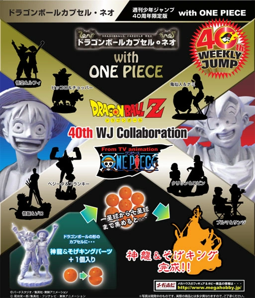 Dragon Ball Capsule Neo - Weekly Shonen Jump 40 Years Limited Edition with One Piece est une série de figurines Gashapon produite par MegaHouse. C'est une partie de la série Capsule, plus spécifiquement Dragon Ball Capsule Neo line, qui surpasse l'ancien Dragon Ball Capsule, car elle est de qualité.
