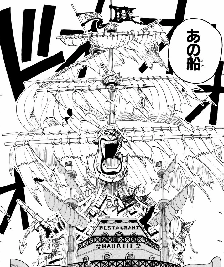 Lors de la première apparition de Mihawk, ce dernier a alors fendu le navire pour s'amuser, laissant ainsi les morceaux couler et devenir le lieu de la bataille entre Monkey D. Luffy et Don Krieg.