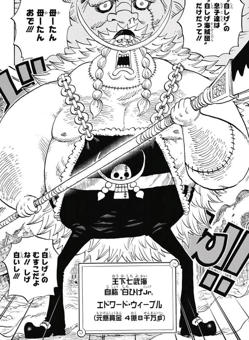 Edward Weevil, [2] (エドワード・ウィーブル, Edowādo Wīburu) ou "Barbe Blanche Jr" est un ancien[4] grand corsaire[4] qui s'est autoproclamé fils d'Edward Newgate.[1] Sa mère est Bakkin, qui elle s'est autoproclamée "Amante de Barbe Blanche".