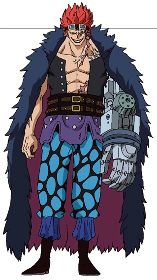 Il est vêtu d'un costume extravagant composé d'un pantalon noir couvert de taches jaunes, se terminant en pâles bandes rouges qui pèsent sur ses bottes, et autour de la taille il a une large ceinture bleu clair, un ceinturon avec une boucle circulaire et des bracelets dorés autour de chaque poignet. Il a également une mince bandoulière, avec des boulons minuscules, qui vont en diagonale sur son épaule jusqu'à sa taille, où il conserve un poignard avec une poignée de style japonais et ce qui semble être un pistolet à silex. Torse nu, Eustass Kid ne porte qu'un manteau de fourrure sur les épaules, ce qui met en valeur son corps musclé. Celui-ci a une rangée de trois piques de chaque côté, son col est très évasé et large, et est de deux couleurs différentes, rouge bordeaux à l'intérieur et marron foncé à l'extérieur. Il porte ce manteau d'une manière assez particulière : le bras droit dans une manche et le bras gauche hors du vêtement.