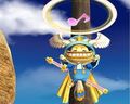 Il a la peau blanche et jaune, un chapeau bleu avec des ailes d'anges dessus, un sabre, une queue multicolore et une auréole avec une note de musique rose au dessus.