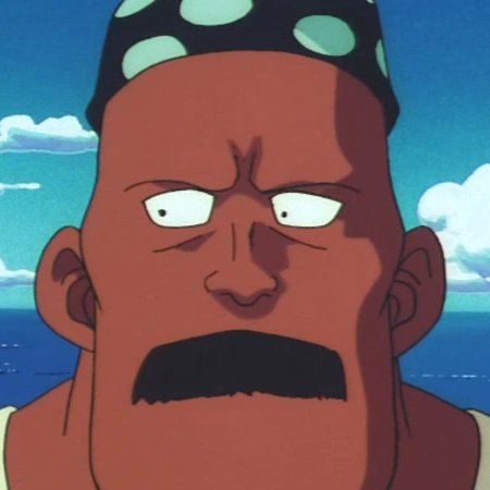 Ganzo est un homme à la peau sombre chauve, il a un bandana noir avec des pois plus clair. Il porte un haut blanc avec un tablier bleu. Il a une large moustache.