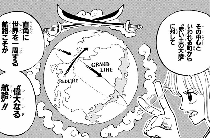- ↑ One Piece Manga — Tome 3, Chapitre 22 : Nami explique que sont Grand Line et Red Line.