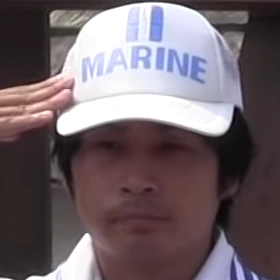 Il porte l'uniforme standard de la Marine et un chapeau de la Marine sur ses courts cheveux noirs.[ 1]