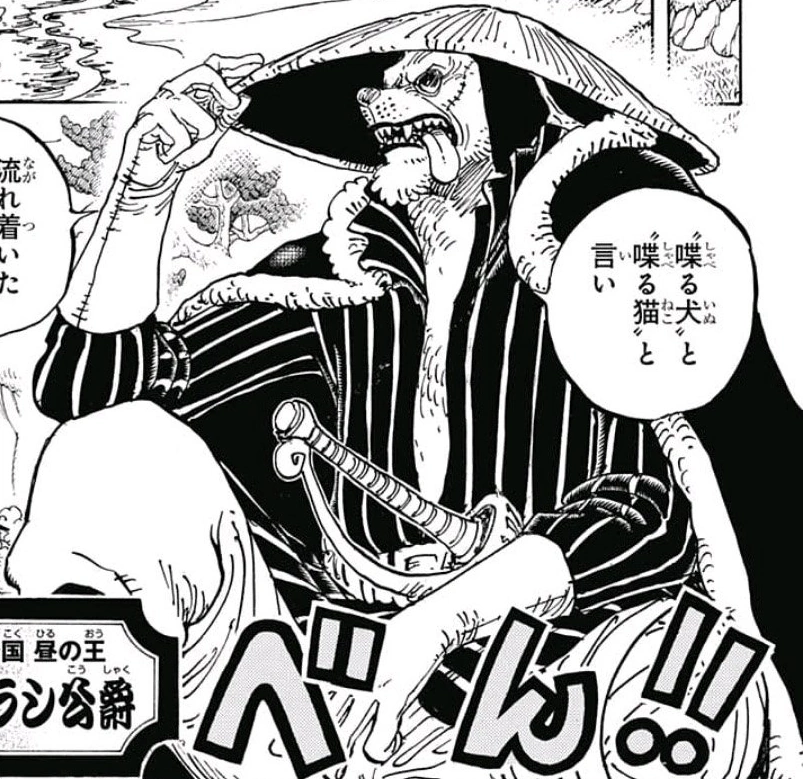 Inuarashi demande à Luffy si ça va aller pour récupérer Sanji. Celui-ci lui répond qu'il ne compte pas se battre contre Big Mom et qu'il compte y aller avec "Pekomamushi". Nekomamushi se rend compte de l'origine du chapeau de Luffy, il explique alors aux pirates que lui et Inuarashi avaient autrefois navigué en tant que subordonnés de Kozuki Oden à bord de l'Oro Jackson avec Gol D. Roger, le roi des pirates. Ils ont aussi été à bord du Moby Dick avec Barbe Blanche.[18] Tous deux commencent alors à parler de leurs anciennes aventures avec nostalgies, mais Nami les interrompt. Elle demande alors ou mène le Log Pose si on a besoin des Road Ponéglyphes pour trouver Rough-Tell, mais elle est interrompue par ses compagnons quand elle cite Crocus et ils commencent à parler de lui.