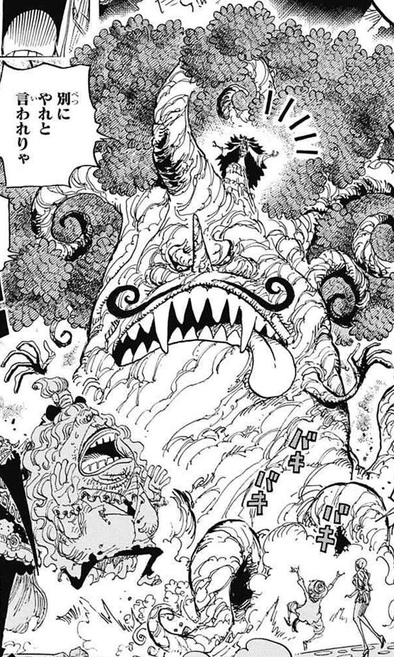- ↑ 6,0 et 6,1 One Piece Manga et Anime - Tome 84, Chapitre 841, Épisode 802 - King Baum est revu sans branches.