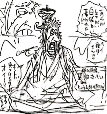 - Dans Road To Laugh Tale a montré l'art conceptuel d'une scène supprimée qui montrait Kurokoma en personne et étoffait sa personnalité et ses motivations. Dans l'art conceptuel, il reçoit le nom complet de Kurokoma Kihei (黒駒きへい) et est décrit comme le "surveillant auto-nommé de la capitale". La scène montre ses subordonnés lui apportant Tsurujo capturé pour qu'il soit retenu en otage et force Kinemon et Denjiro à rendre le petit du dieu de la montagne. Kurokoma révèle alors son intention d'inciter son parent à attaquer Hyogoro, ce qui dans le manga actuel n'était qu'une déduction de Denjiro. Dans le manga final, les subordonnés de Kurokoma et Tsurujo sont mangés par le dieu de la montagne avant d'atteindre la capitale des fleurs et Kurokoma.[2]